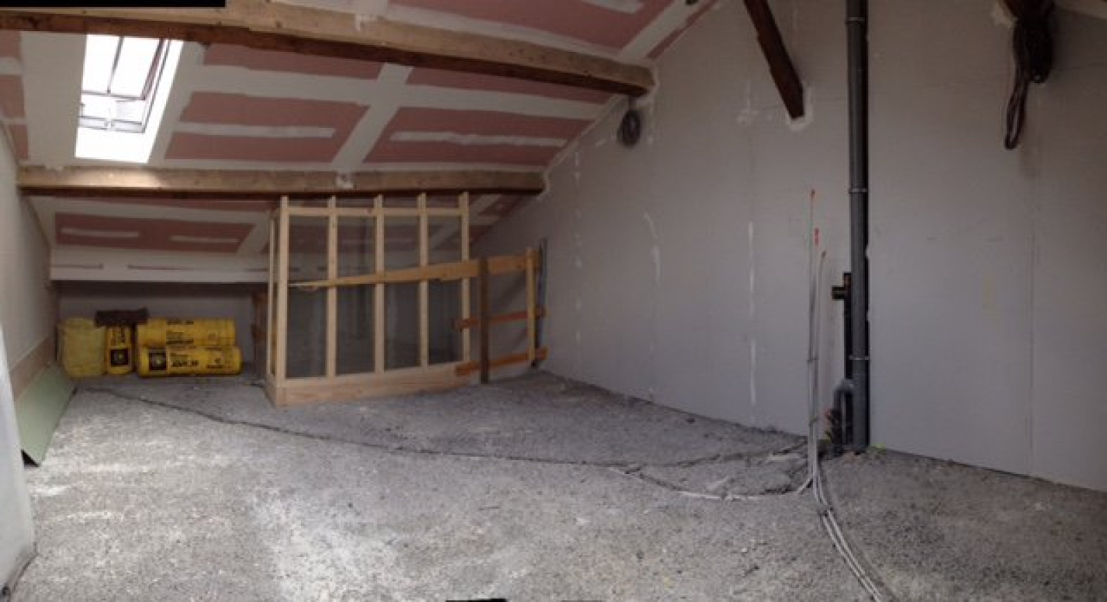 Dans un immeuble entièrement rénové, plateau d'habitation de 83 m2 carrez (92 m2 utile)à rénover entièrement situé au 3ème et dernier étage sans ascenseur, agréable pièce à vivre éclairée par fenêtres de toit (verrière et velux), deux chambres au niveau inférieur de 15 et 17 m2 et une salle de bains.