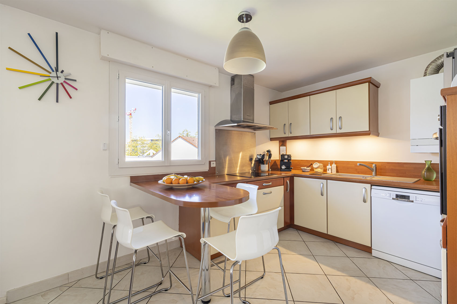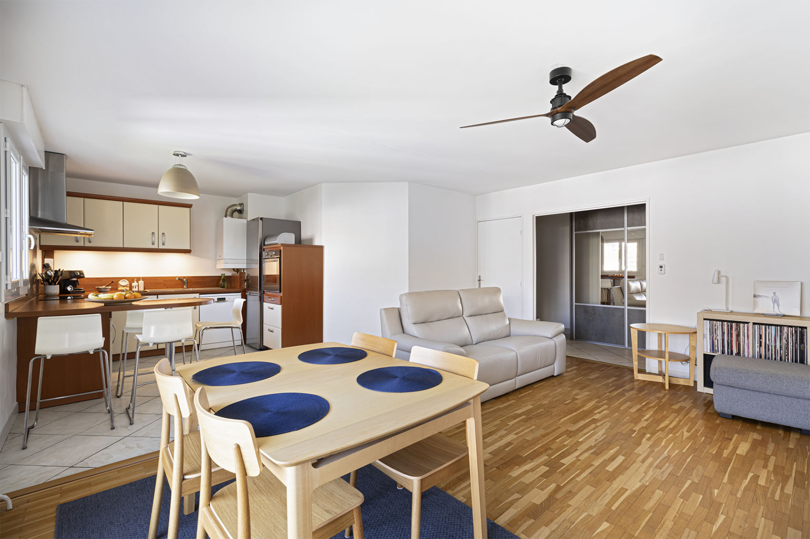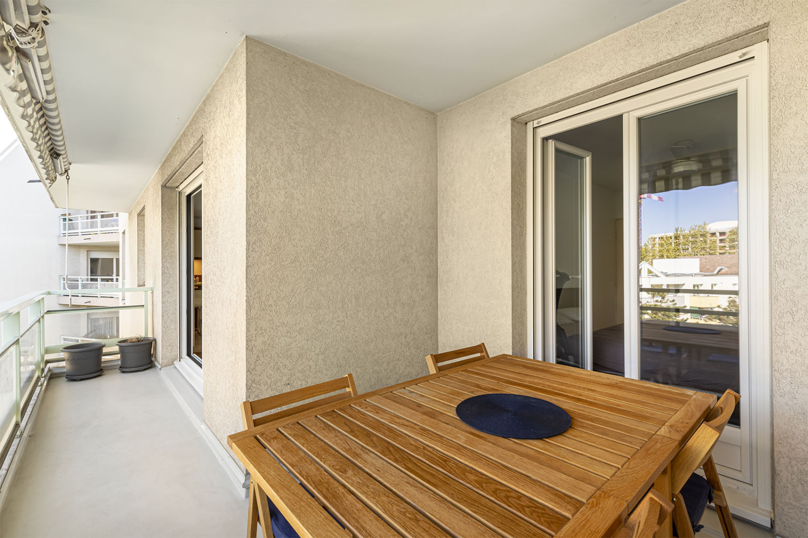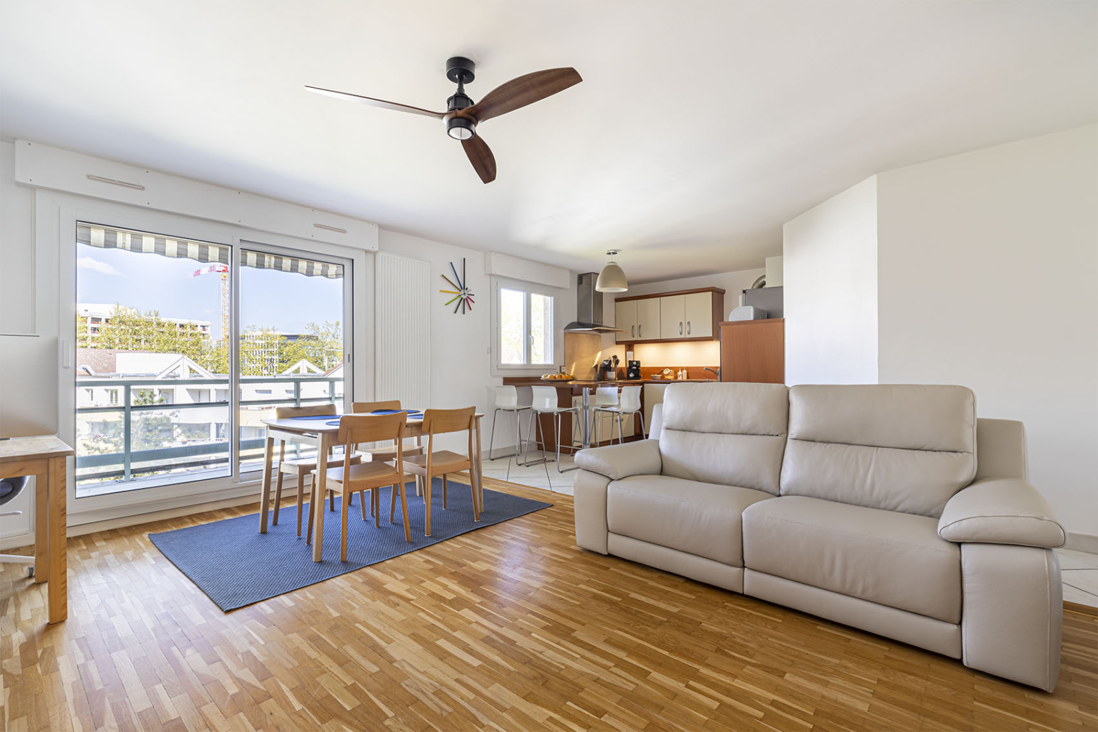 Vous apprécierez la vaste pièce de vie comprenant une cuisine équipée ouverte sur la salle à manger et un espace détente unique de 10 m2 avec ce balcon à vivre côté jardin, très calme et ensoleillé.