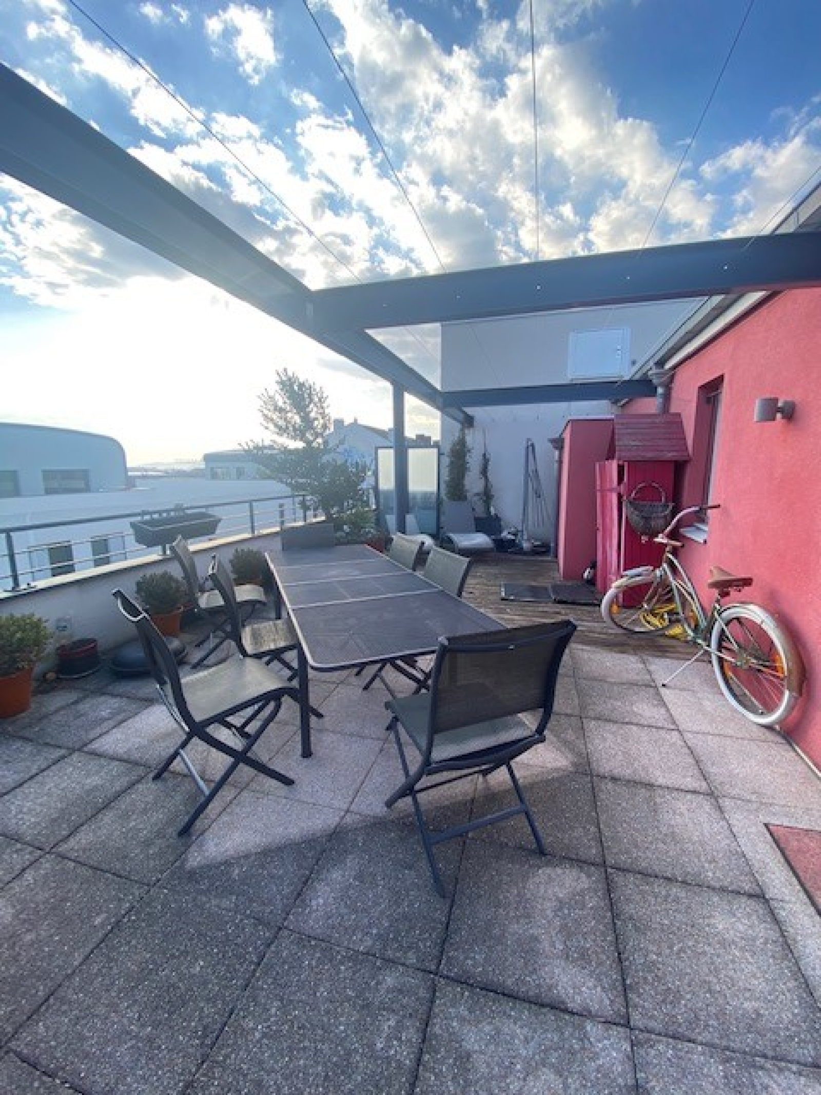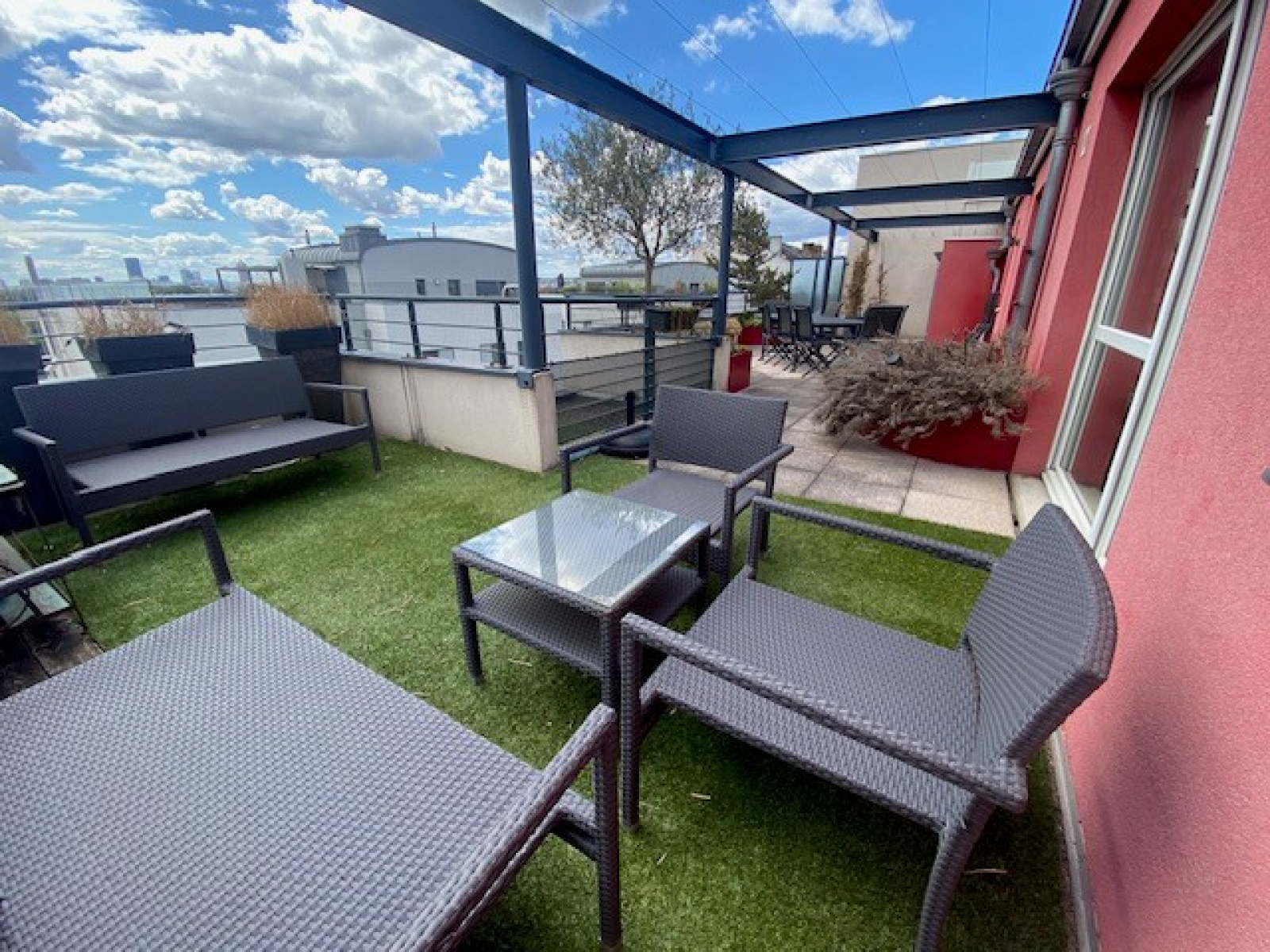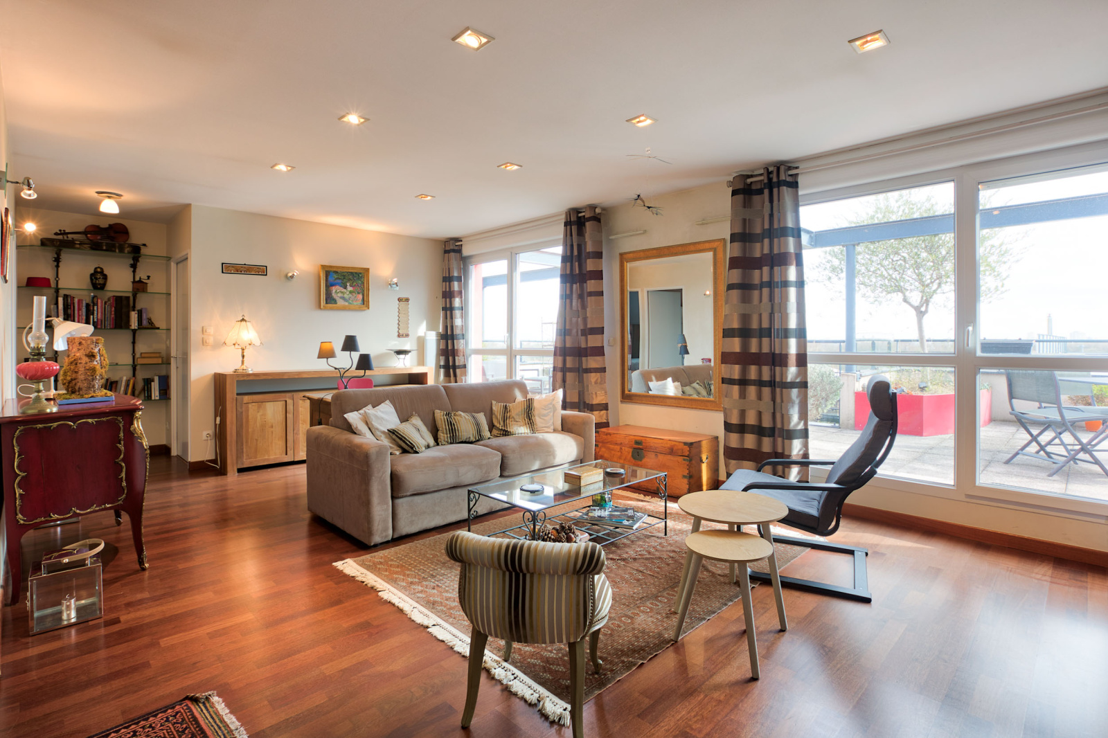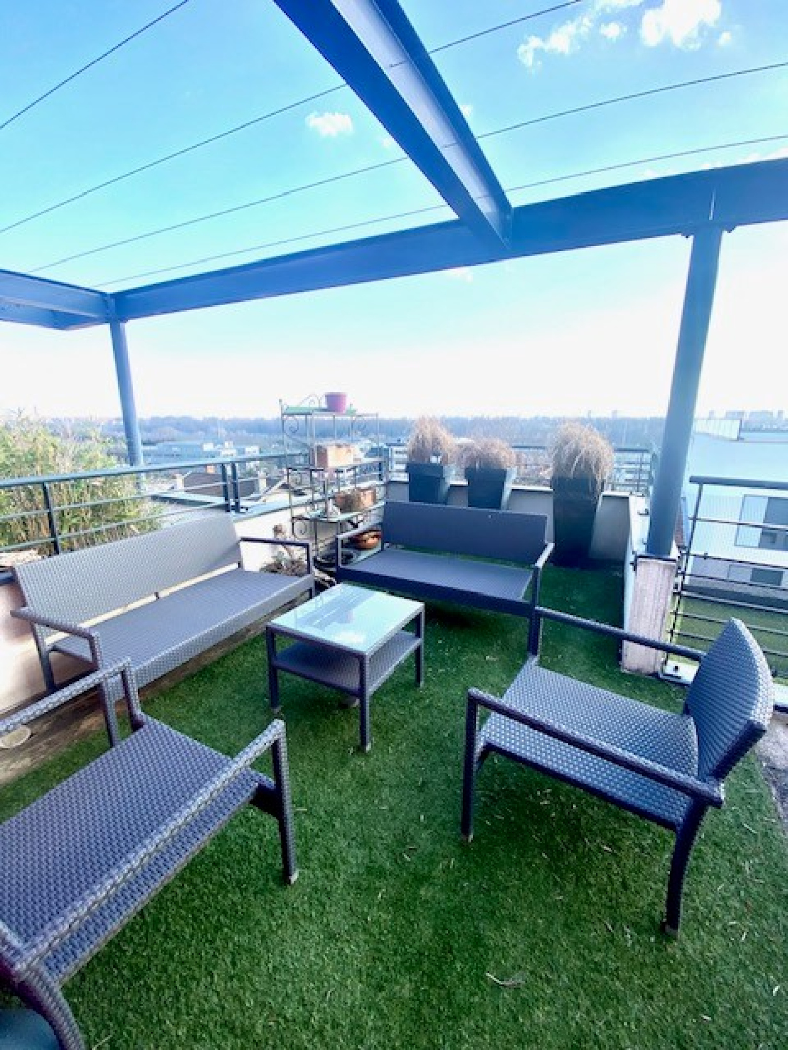 Exceptionnel appartement de type attique, véritable toit terrasse de 97 m2 au 5ème et dernier étage, 80 m2 en surfce carrez, doté d'une fabuleuse terrasse à ciel ouvert de 60 m2, profitant d'une vue dégagée à 180 degrés, et parfaitement aménagée et végétalisée.