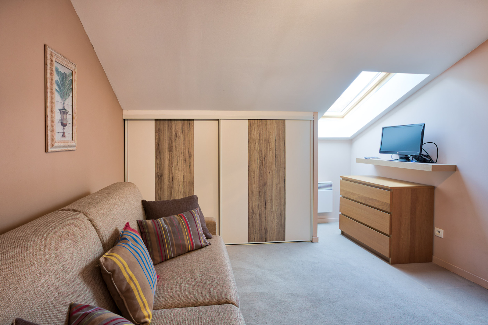 Coté nuit, vous apprécierez les deux chambres mansardées avec placards muraux, une vaste salle de bains de 8 m2 avec toilettes, placards et une fenêtre.
