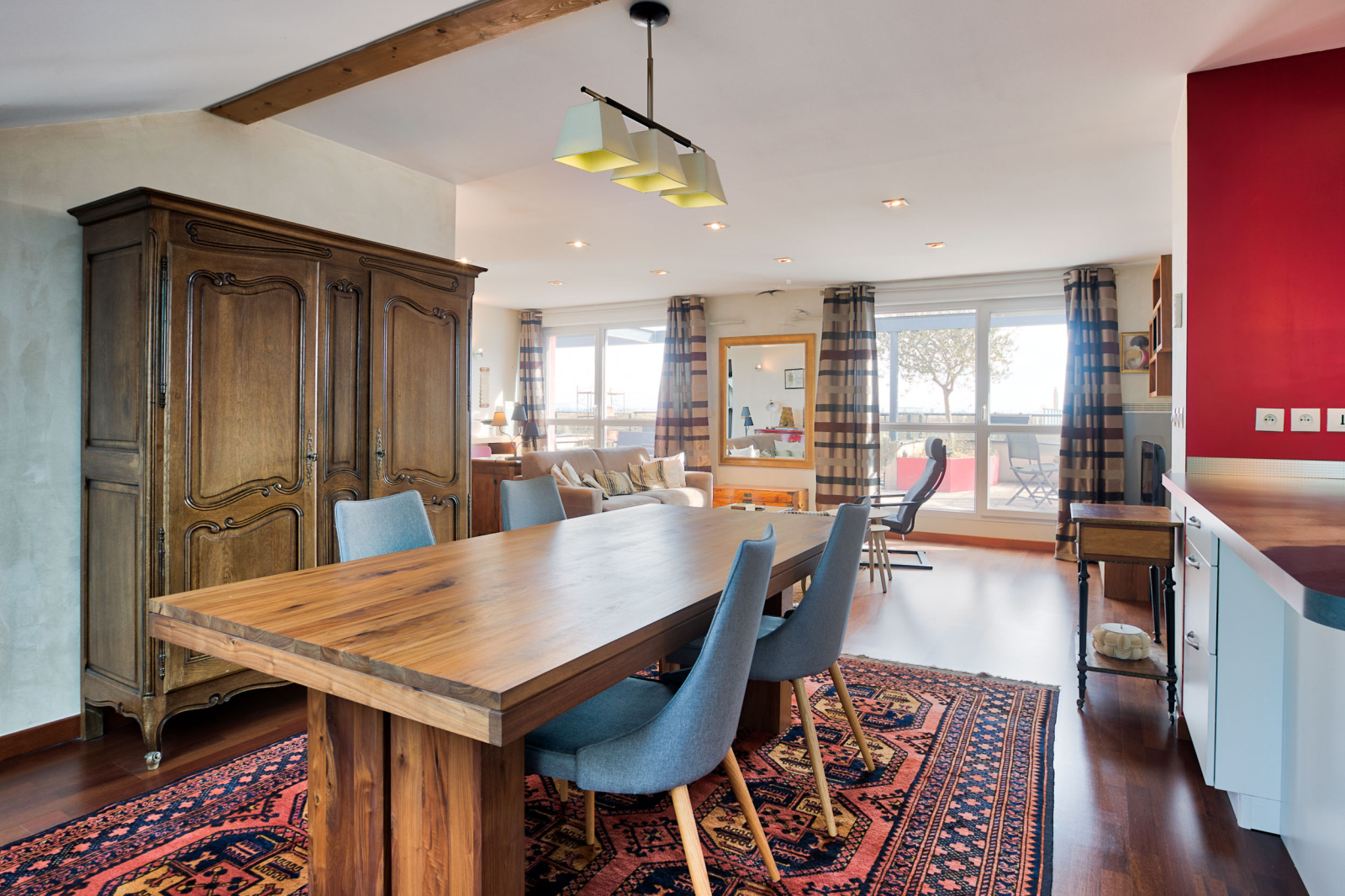 Le salon ainsi que la salle à manger très lumineux, en parquet, accèdent directement à la terrasse exposée Sud.