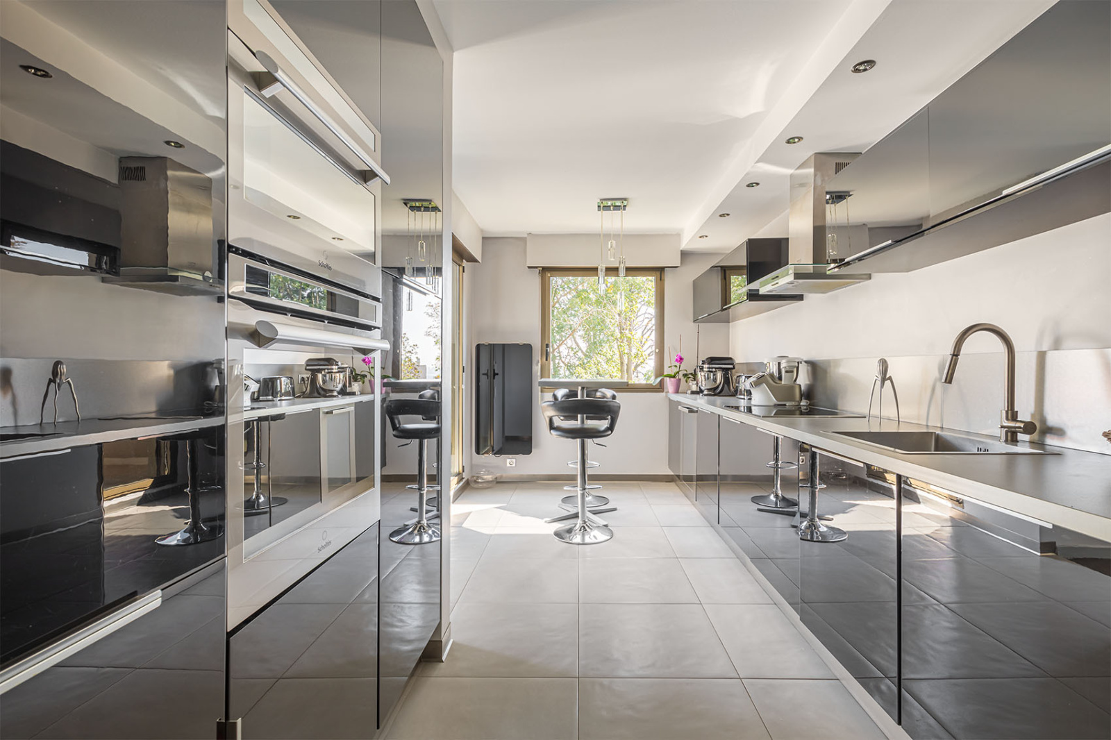 L'entrée dessert une cuisine entièrement équipée, avec accès direct à la terrasse de 11 m2, un vestiaire et toilettes d'invités, et la vaste pièce de vie en parquet exposée Est.