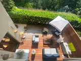 Vous apprécierez la pièce de vie de 40 m2 en parquet accédant à la terrasse en bois exotique, une hâvre de paix pour déjeuner et recevoir les amis, une cuisine entièrement aménagée semi-ouverte et un espace dressing- toilettes-buanderie à l'entrée.