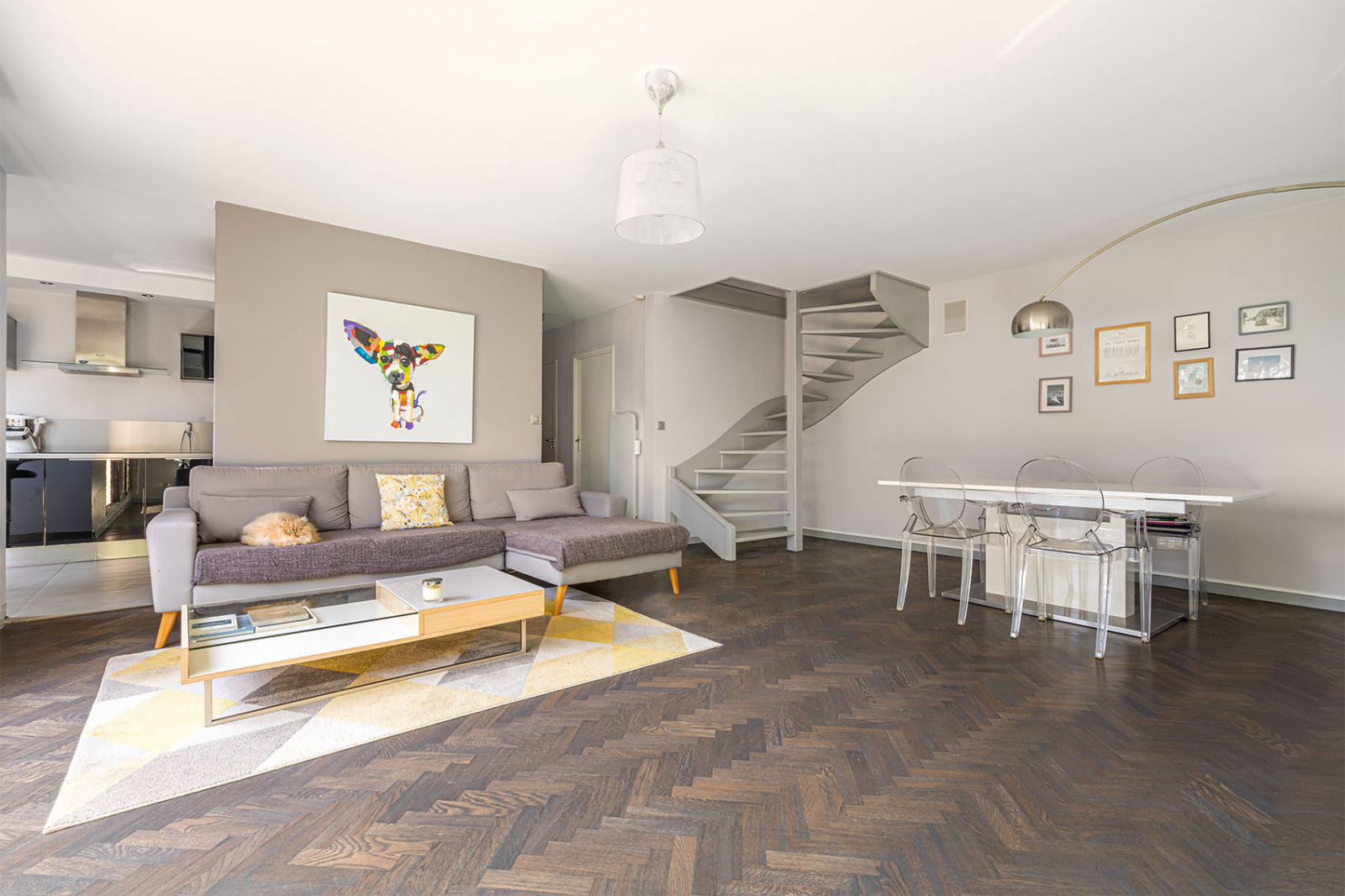 L'entrée dessert une cuisine entièrement équipée, avec accès direct à la terrasse de 11 m2, un vestiaire et toilettes d'invités, et la vaste pièce de vie en parquet exposée Est.