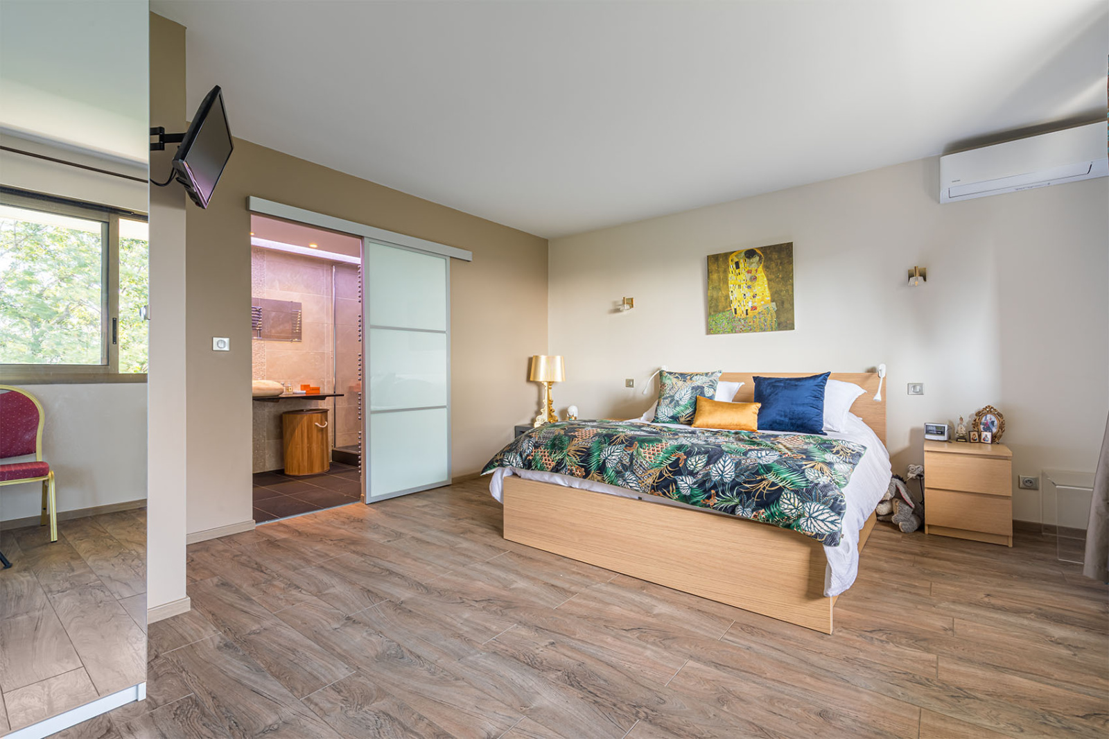 A l'étage, un espace nuit proposant actuellement une chambre de 22 m2 (à l'origine 2 chambres), sa salle de douche contemporaine, une seconde chambre de 14,50 m2, une salle de bains balnéo et toilettes indépendants.